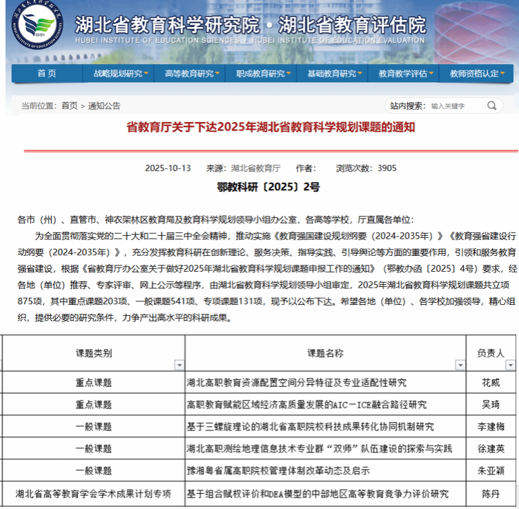 10月13日,湖北省教育厅印发《关于下达2025年湖北省教育科学规划课题的通知》,我校立项重点课题2项、一般课题3项、专项课题1项。立项数首次突破6项,创历史新高,在全省高职院校中名列第四。这也是我校文科继“2023年省教育厅哲社研究项目立项数(7项)居全省第四”后取得的又一佳绩。